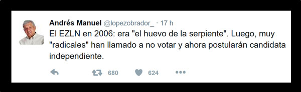 Pero no se detenga usted en la lectura de estas expresiones de inseguridad y ansiedad existencial que aún rondan por las redes sociales de la Internet, mejor desarrolle usted mismo una interpretación política del momento en el entendido de que para la coyuntura electoral de 2018 la posición que prevaleció fue: “Detrás de mí o contra mí”, que todo fascismo supone. Así, López Obrador y la élite de Morena llamaron a no firmar por Marichuy mientras el temor de la propuesta evidenció sus propias fobias y filias, para luego dar paso a una actitud hipócrita al enterarse de que la candidata independiente no alcanzaría a capturar la cantidad de firmas requeridas para su registro (Declaración del V Congreso Nacional Indígena, 1ro de enero de 2017):